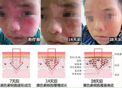 14天后,白斑内色素岛形成,斑痕消失,色差逐步淡化。